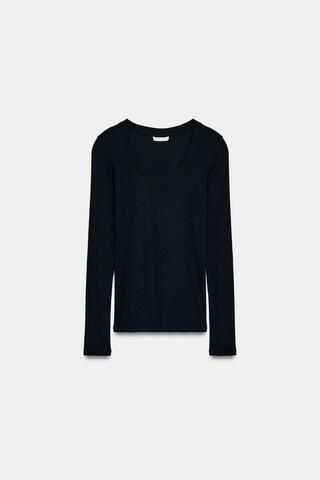 Футболка из хлопковой пряжи. Круглый вырез и длинные рукава. Ткань в рубчик. Прямой низ.