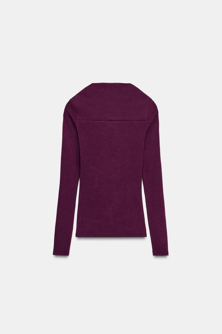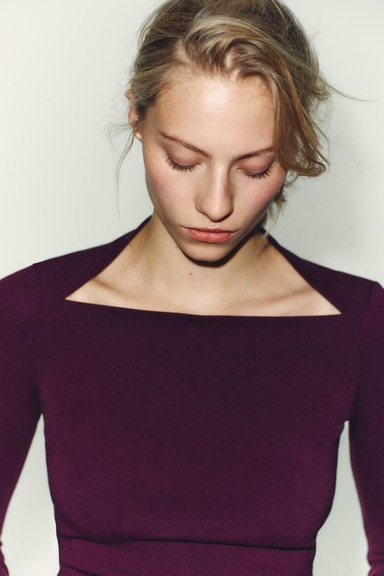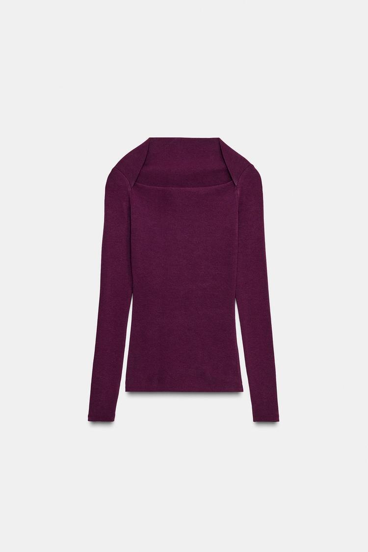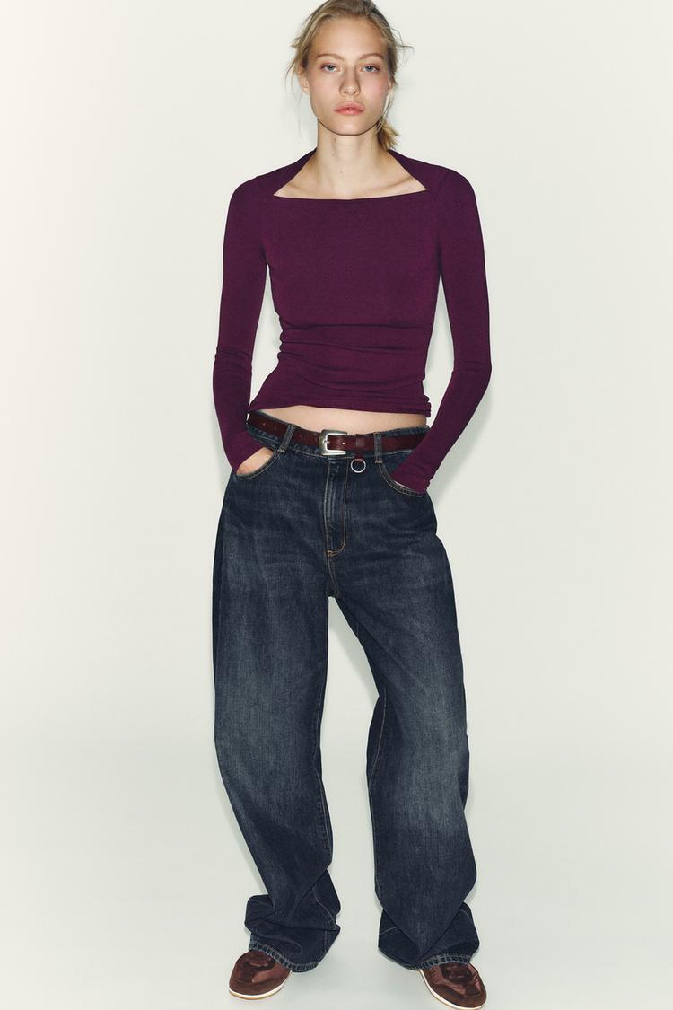 Футболка с квадратным вырезом и длинными рукавами. Ткань в рубчик. Прямой низ.