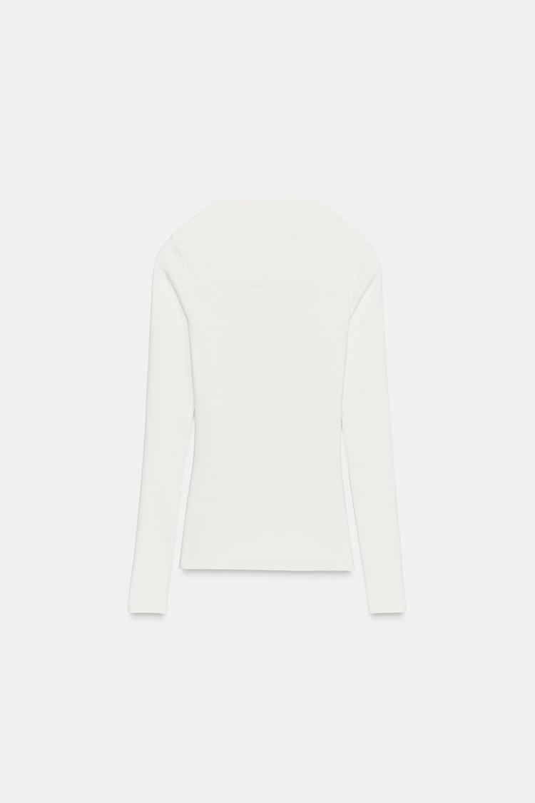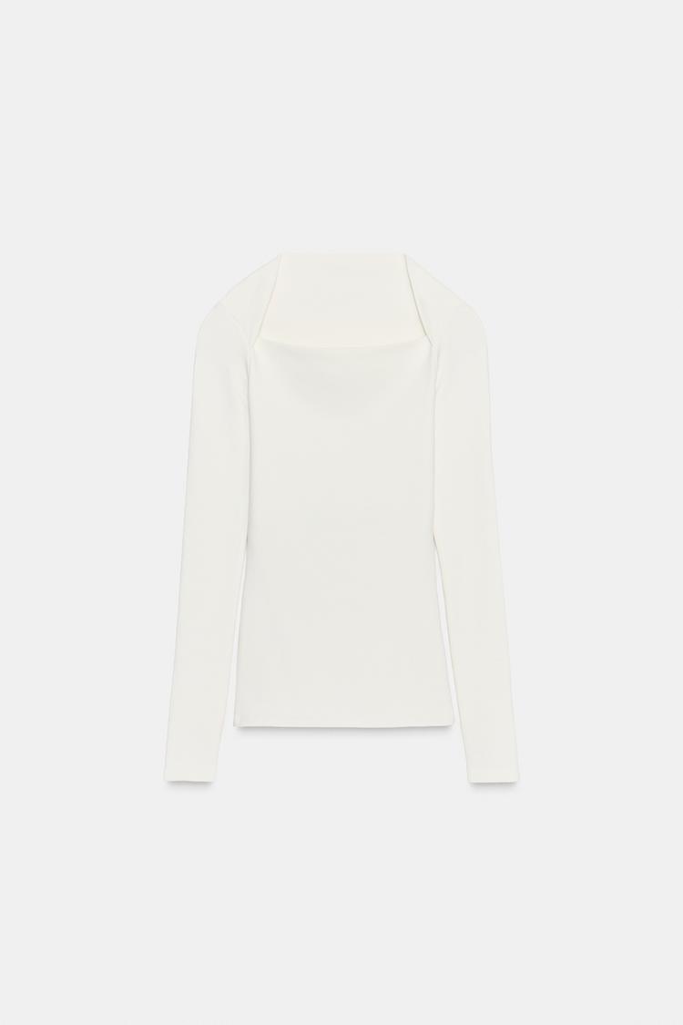 Футболка с квадратным вырезом и длинными рукавами. Ткань в рубчик. Прямой низ.