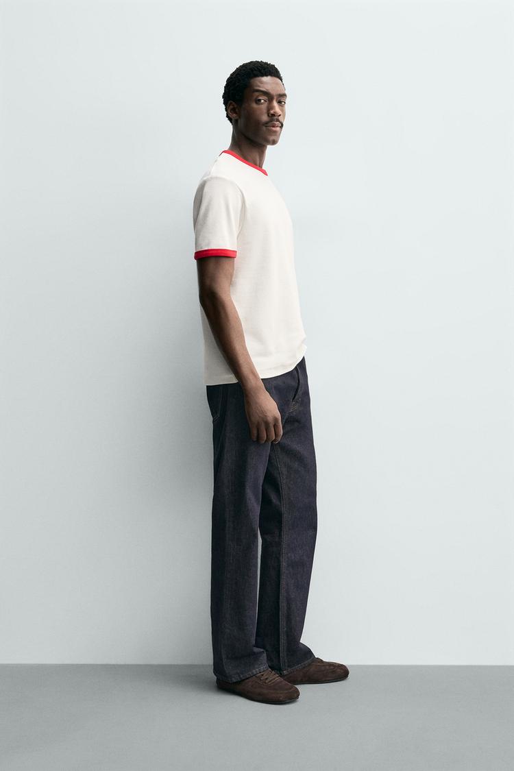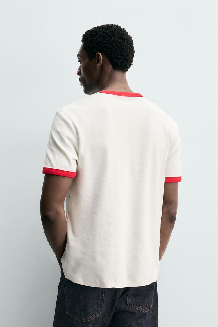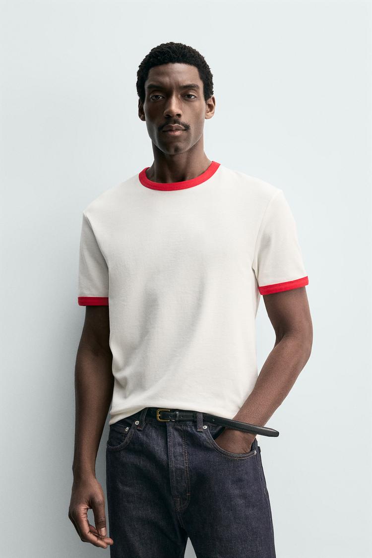 ZARA ФУТБОЛКА В РУБЧИК С КОНТРАСТНОЙ ОТДЕЛКОЙ БАЗОВАЯ, БЕЛЫЙ/КРАСНЫЙ