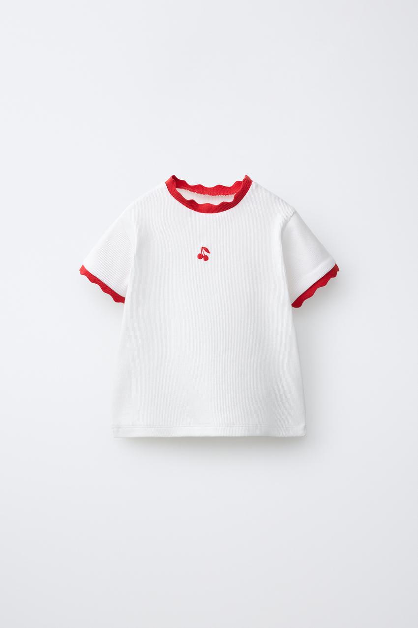 Футболка в рубчик с круглым вырезом и короткими рукавами. Контрастная отделка и вышивка спереди.