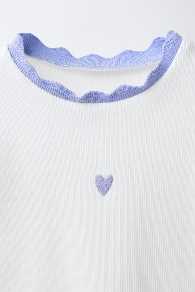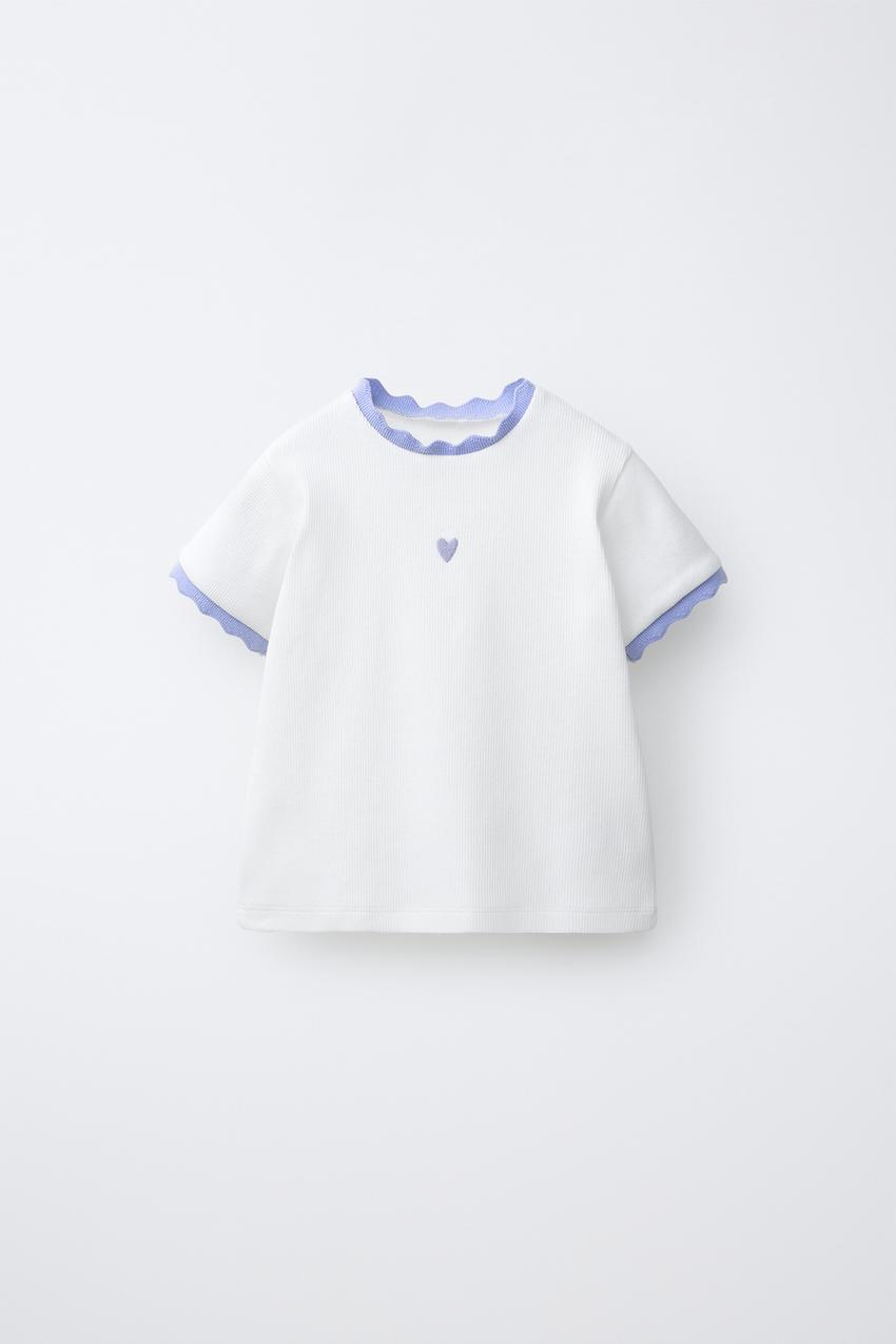 Футболка в рубчик с круглым вырезом и короткими рукавами. Контрастная отделка и вышивка спереди.