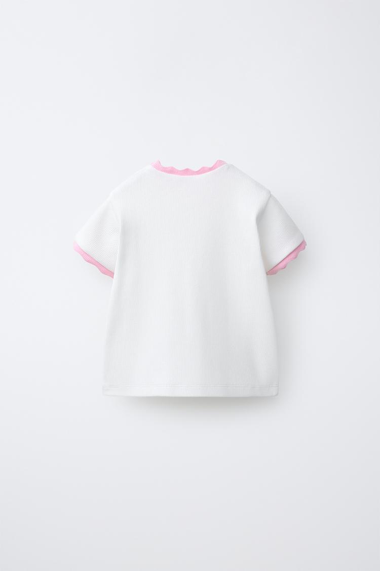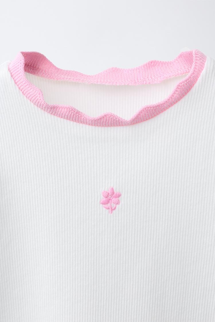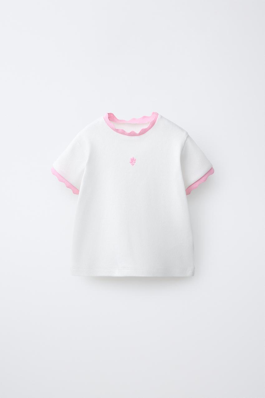 ZARA ФУТБОЛКА В РУБЧИК С КОНТРАСТНОЙ ОТДЕЛКОЙ И ВЫШИВКОЙ, СВЕТЛО-РОЗОВЫЙ