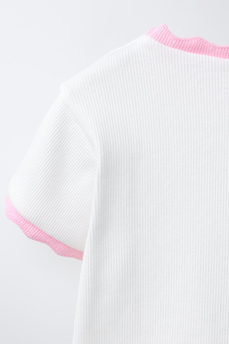 Футболка в рубчик с круглым вырезом и короткими рукавами. Контрастная отделка и вышивка спереди.