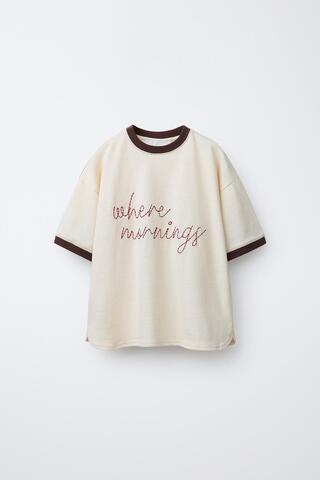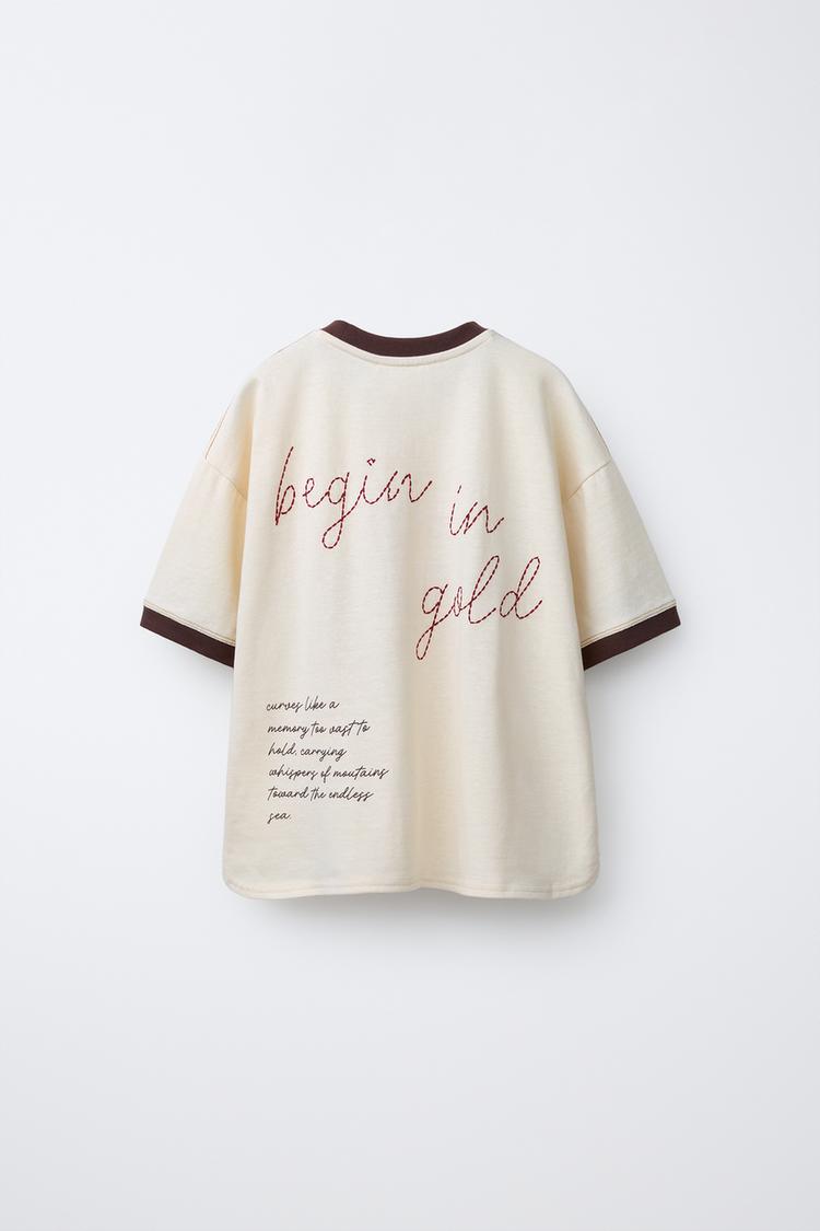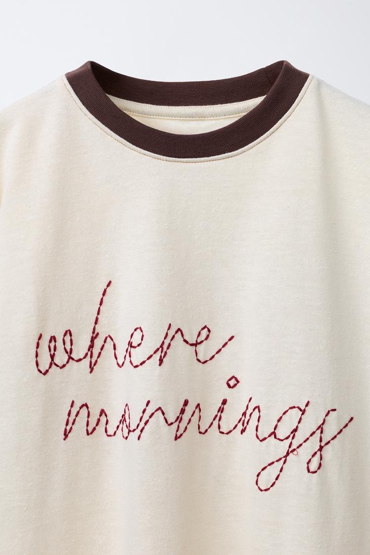 ZARA ФУТБОЛКА В РУБЧИК С КОНТРАСТНОЙ ВЫШИВКОЙ, ЭКРЮ