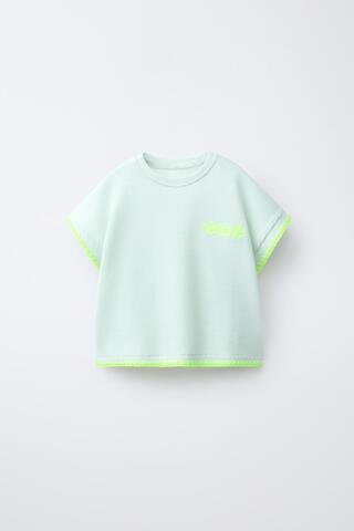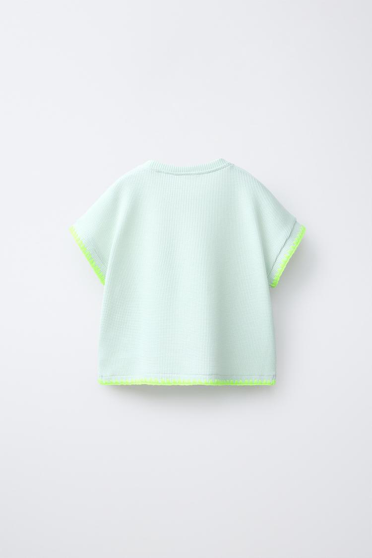 ZARA ФУТБОЛКА В РУБЧИК С КОНТРАСТНЫМ НЕОНОВЫМ ДЕКОРОМ, ЗЕЛЕНОВАТО-СИНИЙ