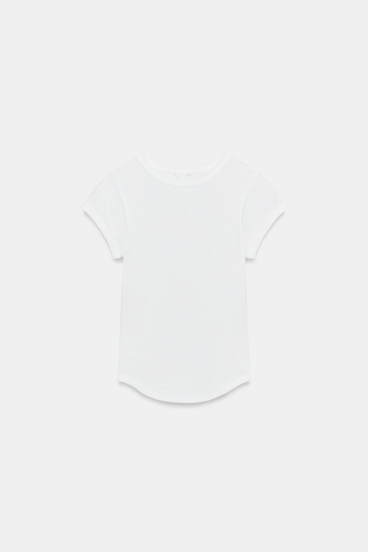 Футболка из смесового хлопка в рубчик. Круглый вырез, короткие рукава и закругленный низ.