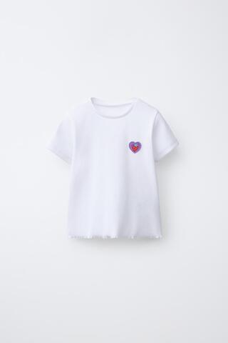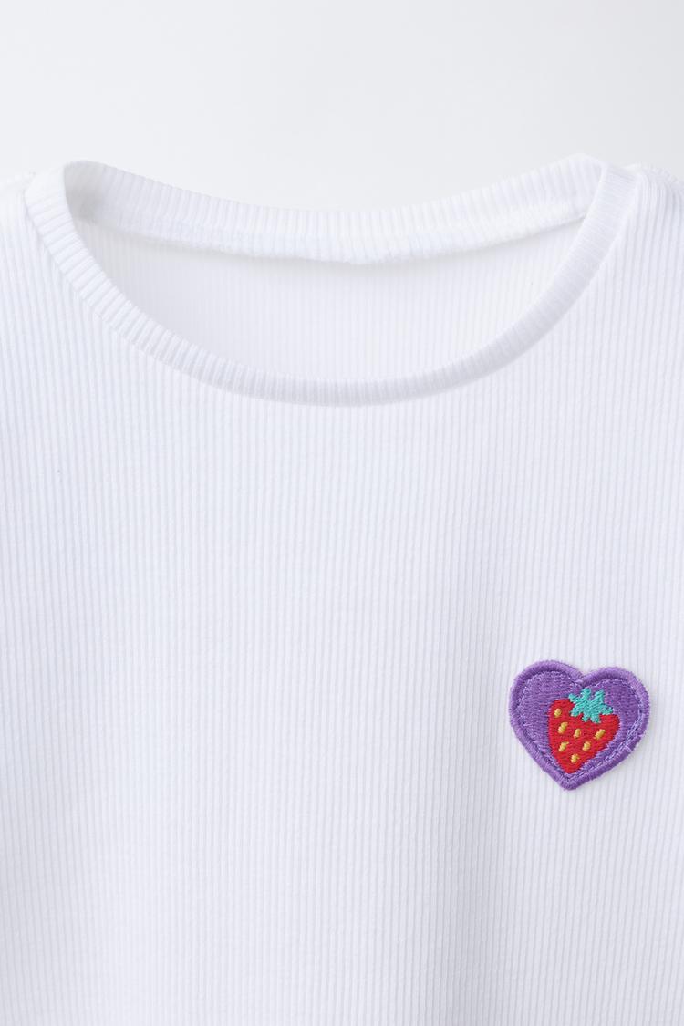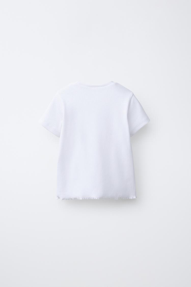 Футболка в рубчик с круглым вырезом и короткими рукавами. Нашивка на груди. Нижний край с волнистой отделкой.