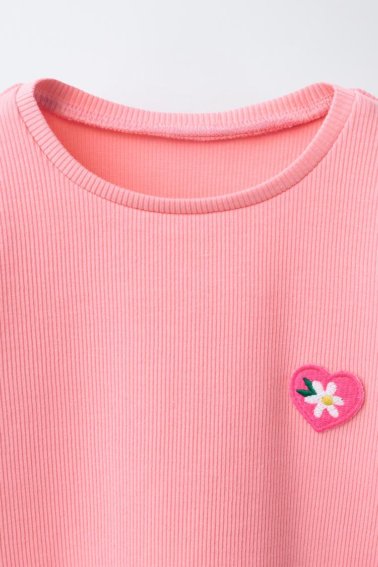 ZARA ФУТБОЛКА В РУБЧИК С НАШИВКОЙ, КОРАЛЛОВЫЙ