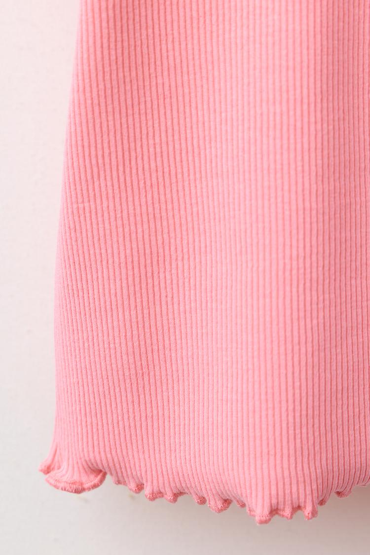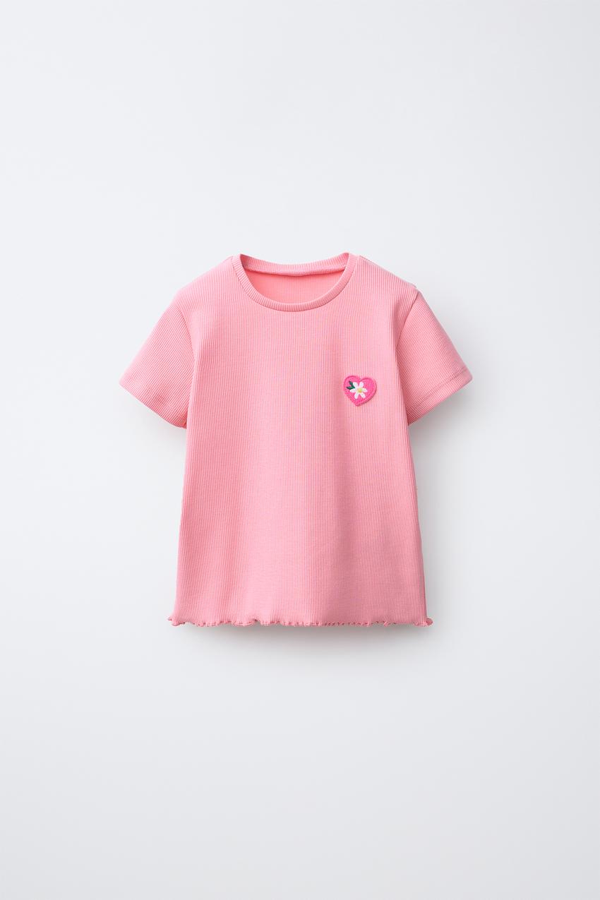 Футболка в рубчик с круглым вырезом и короткими рукавами. Нашивка на груди. Нижний край с волнистой отделкой.