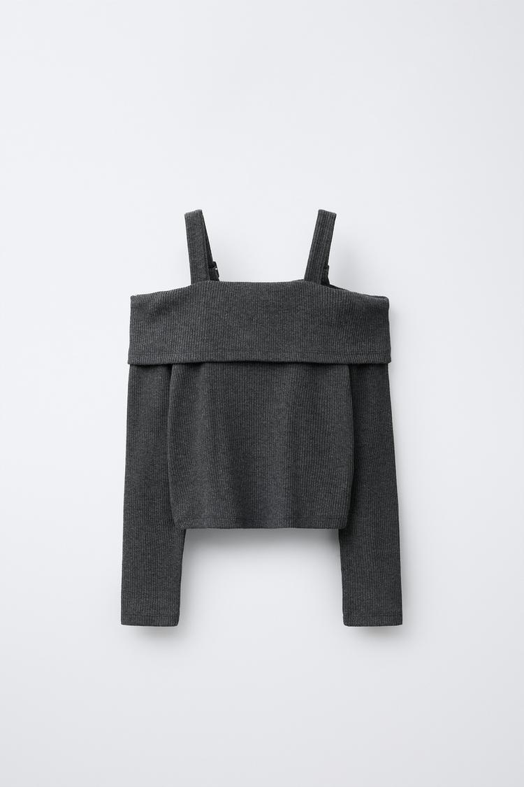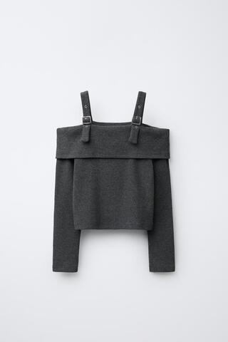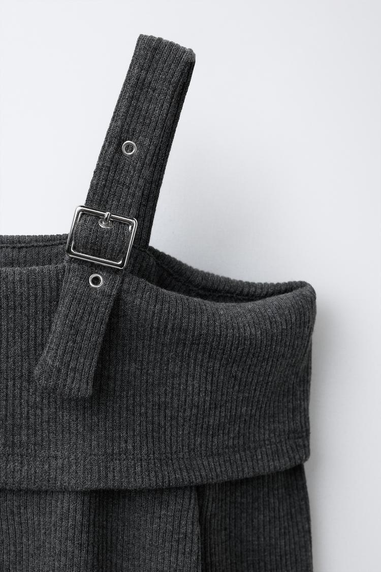ZARA ФУТБОЛКА В РУБЧИК С ПРЯЖКАМИ, СЕРЫЙ МЕЛАНЖ