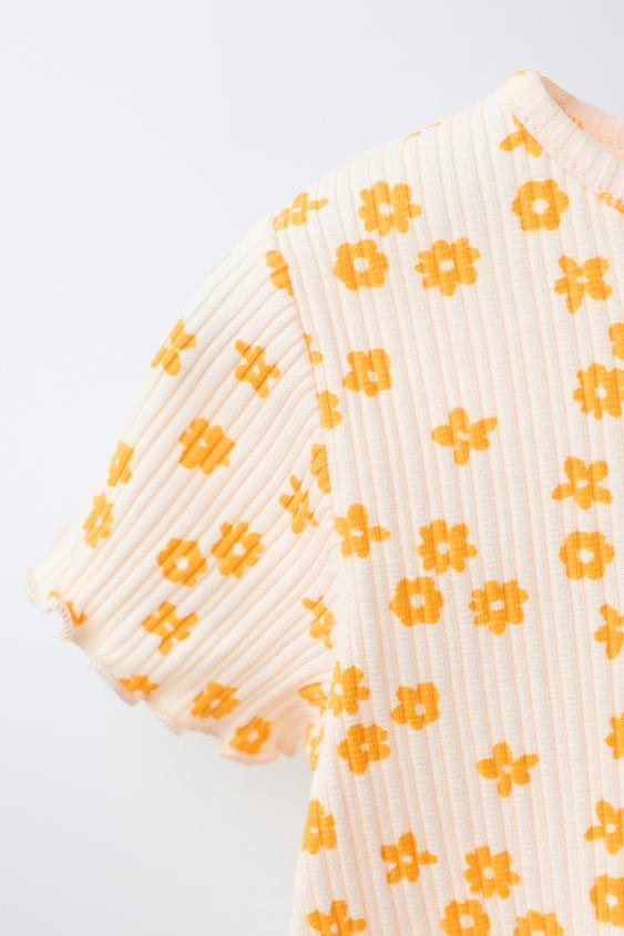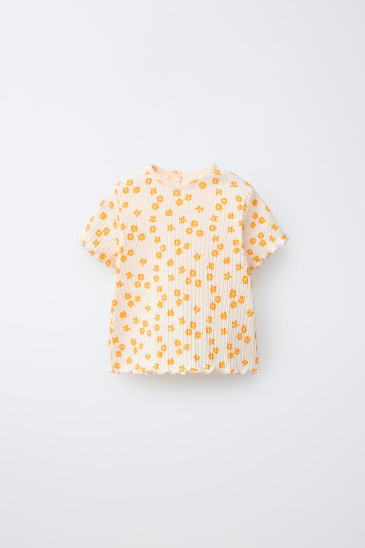 ZARA ФУТБОЛКА В РУБЧИК С ЦВЕТОЧНЫМ ПРИНТОМ, ЭКРЮ/ЖЕЛТЫЙ