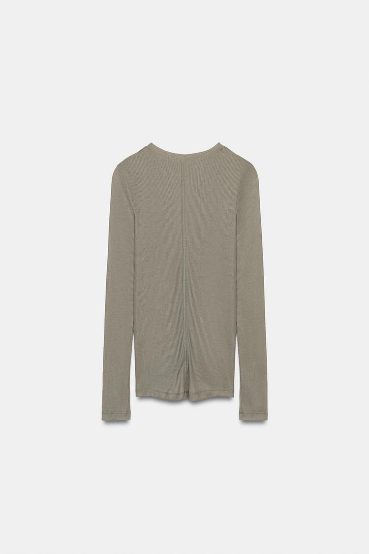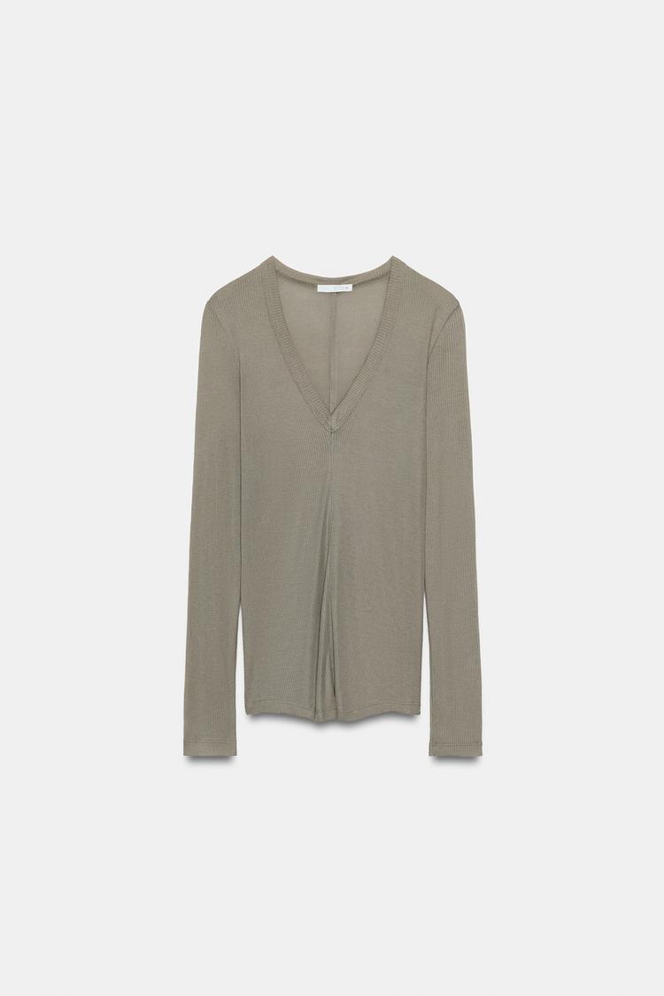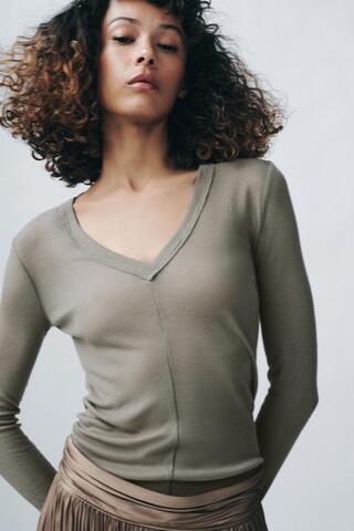 Футболка из пряжи с 20% лиоцелла. V-образный вырез и длинные рукава. Прямой низ.