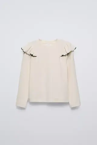 ZARA ФУТБОЛКА В РУБЧИК С ВОЛАНОМ, ЭКРЮ