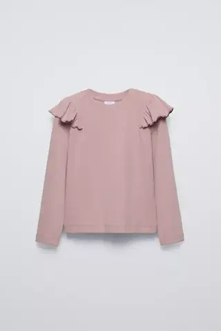 ZARA ФУТБОЛКА В РУБЧИК С ВОЛАНОМ, РОЗОВЫЙ