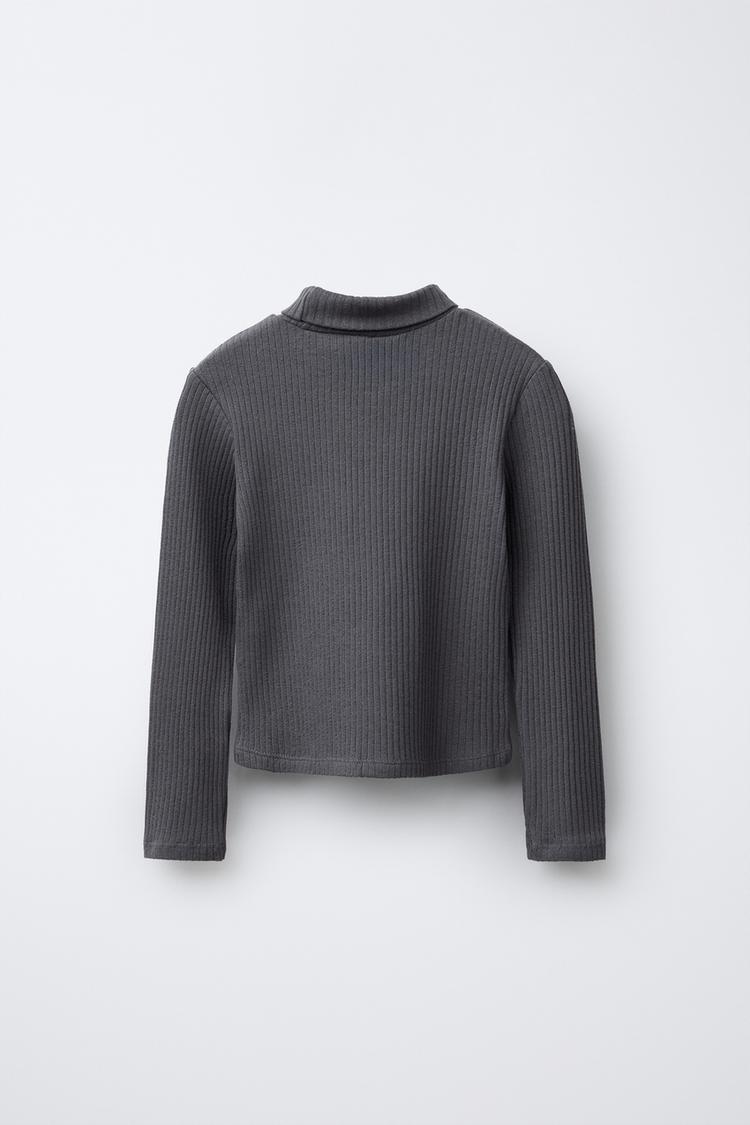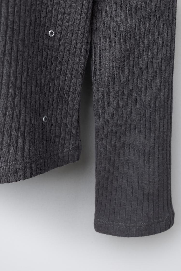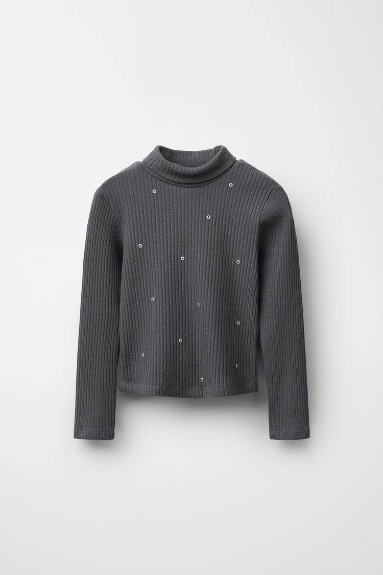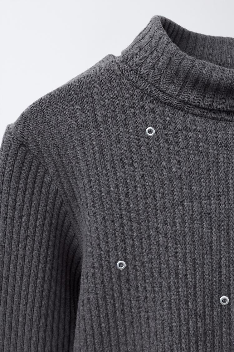 Футболка в рубчик с воротником-стойкой и длинными рукавами. Декоративные заклепки спереди. Ткань из 97% хлопка.