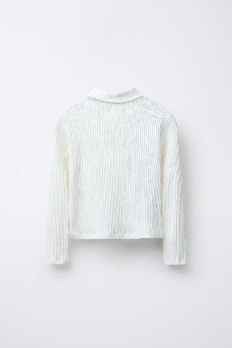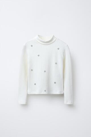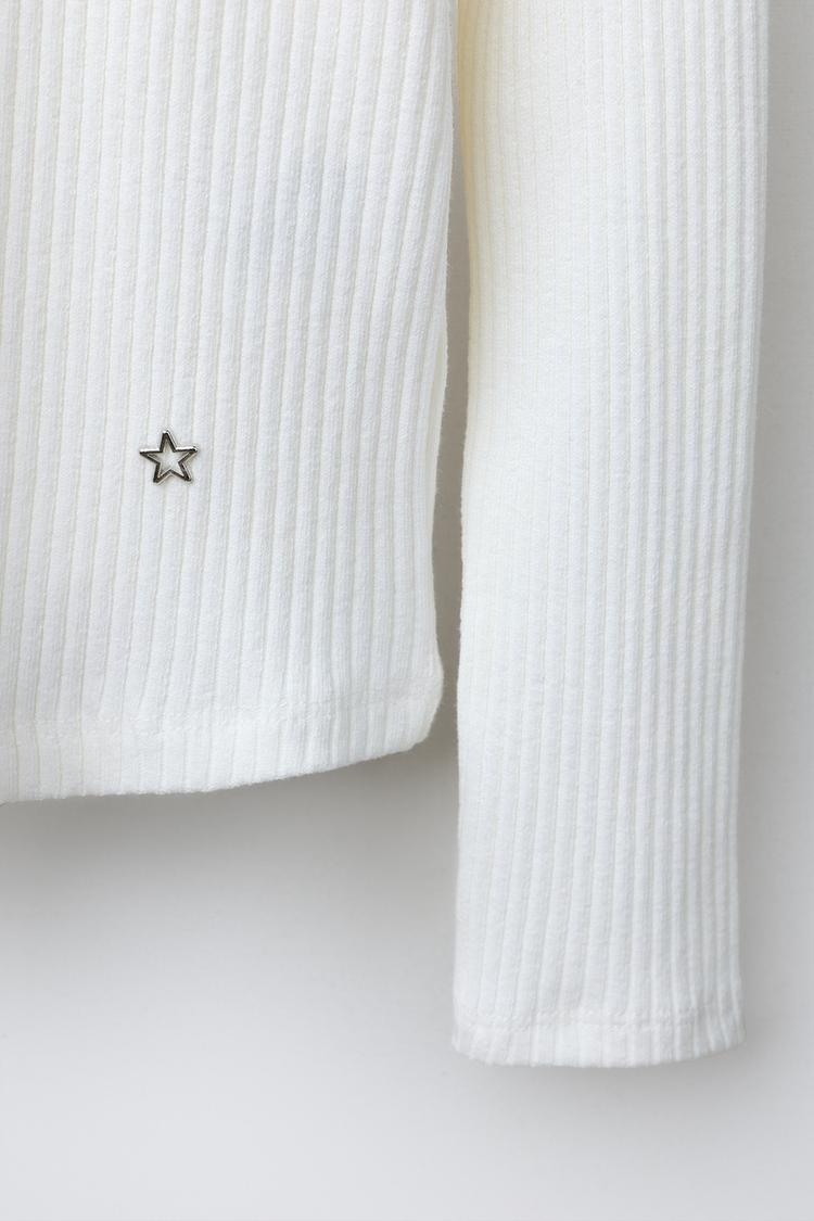 Футболка в рубчик с воротником-стойкой и длинными рукавами. Декоративные заклепки спереди. Ткань из 97% хлопка.