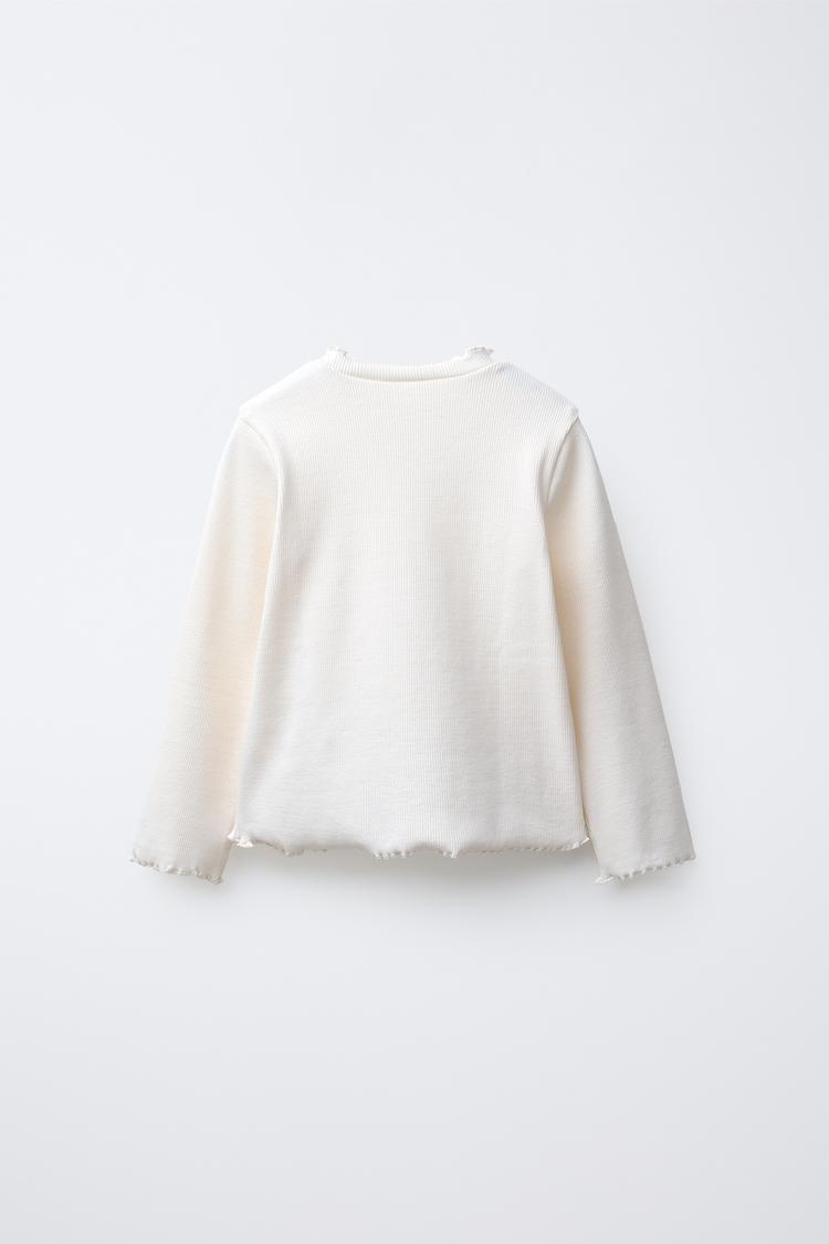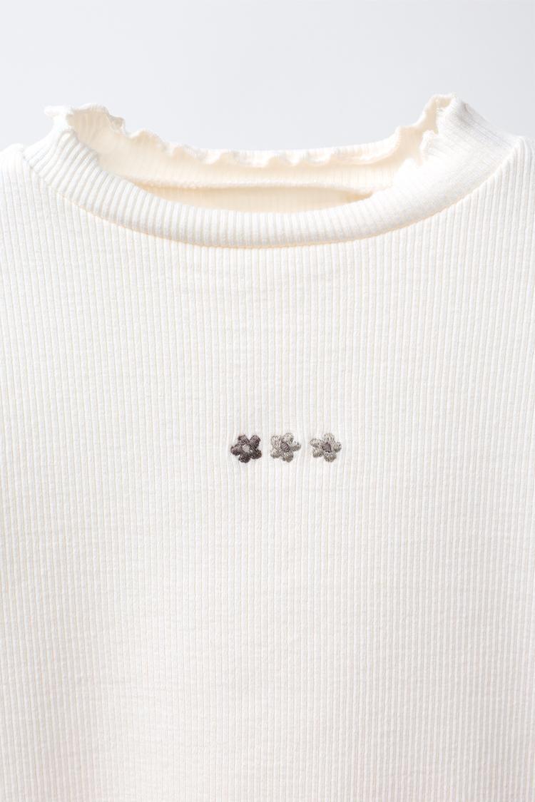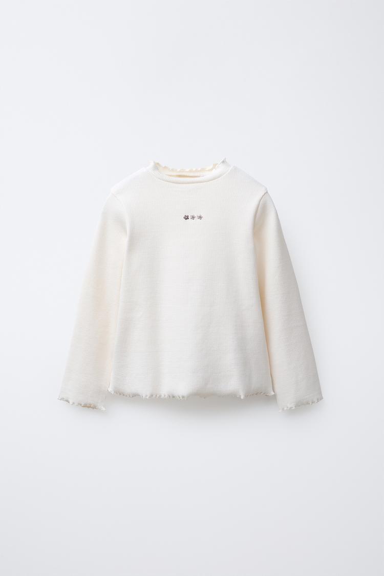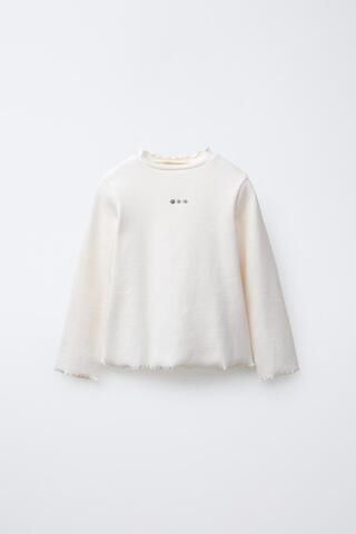 Футболка в рубчик с воротником стойкой и длинными рукавами. Низ с трубчатой отделкой. Вышивка спереди. Ткань из 97% хлопка.