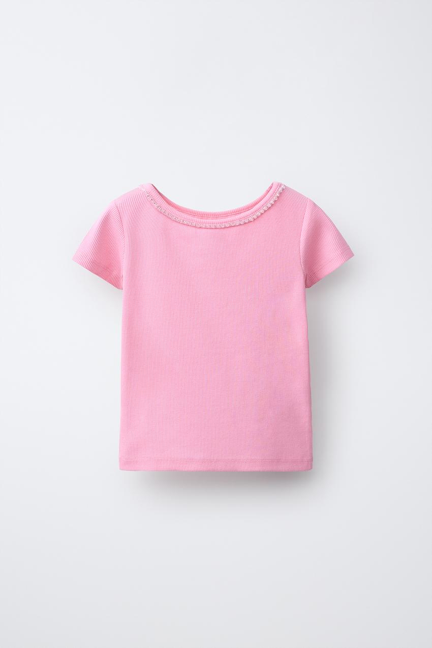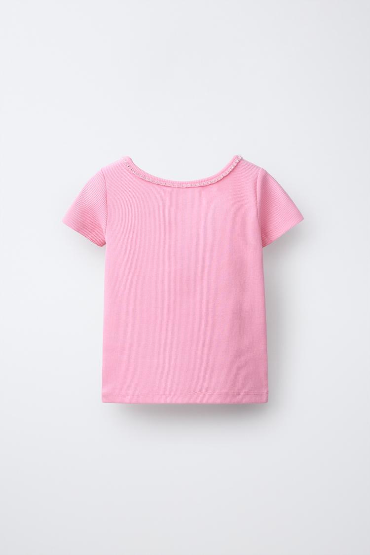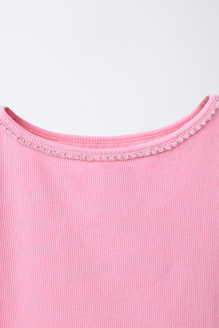ZARA ФУТБОЛКА В РУБЧИК СО СТРАЗАМИ, РОЗОВЫЙ