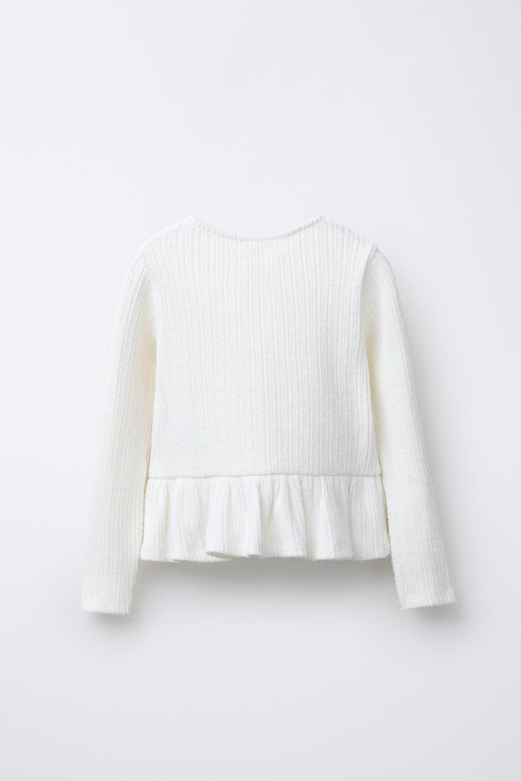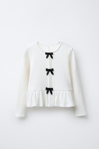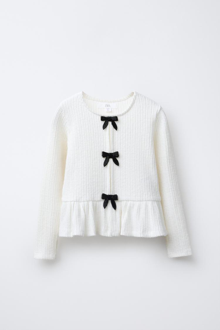 Футболка с круглым вырезом и длинными рукавами. Декоративные банты с бусинами спереди. Низ отделан оборкой.