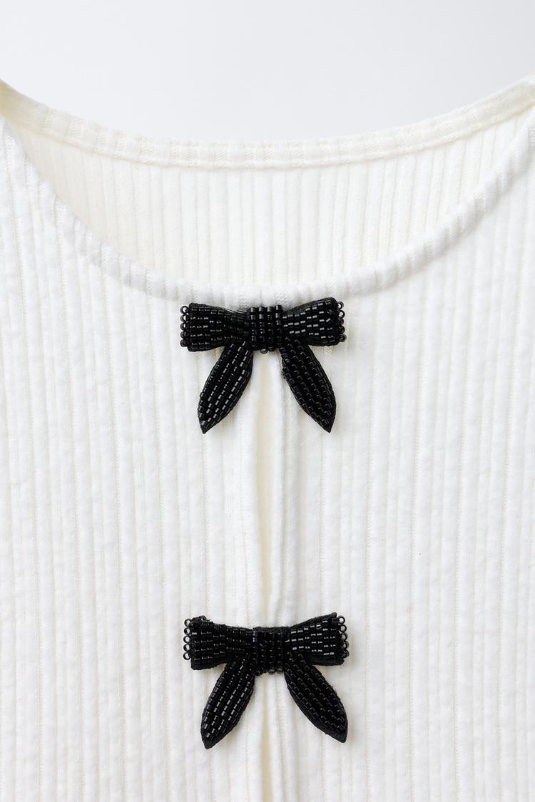 ZARA ФУТБОЛКА В РУБЧИК SOFT TOUCH С БАНТАМИ, ЭКРЮ