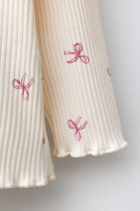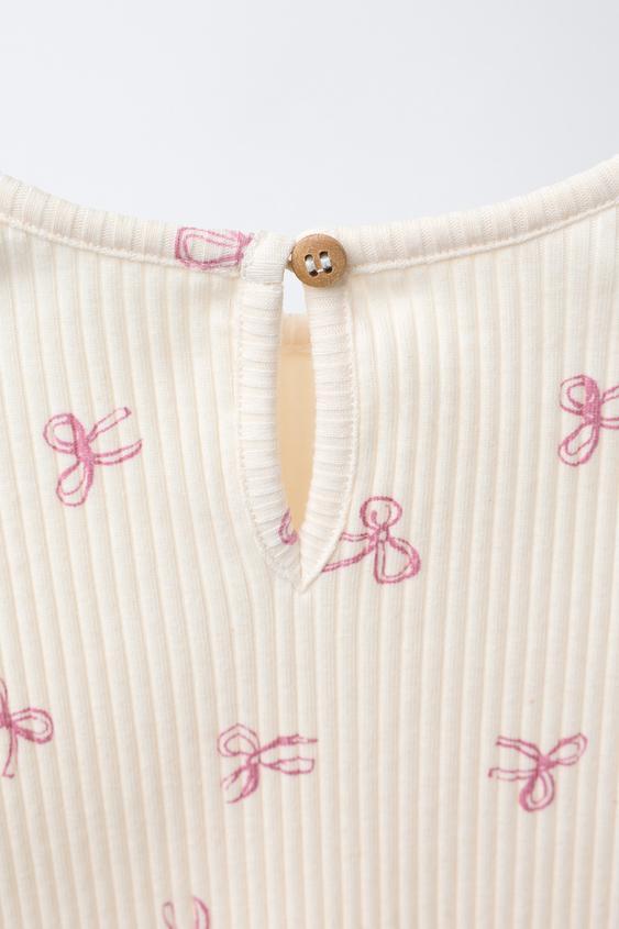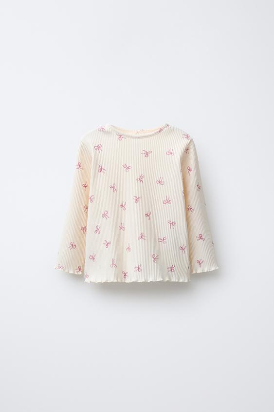 Футболка с круглым вырезом и длинными рукавами. Отделка в рубчик. Принт с бантами. Ткань 48% хлопок.