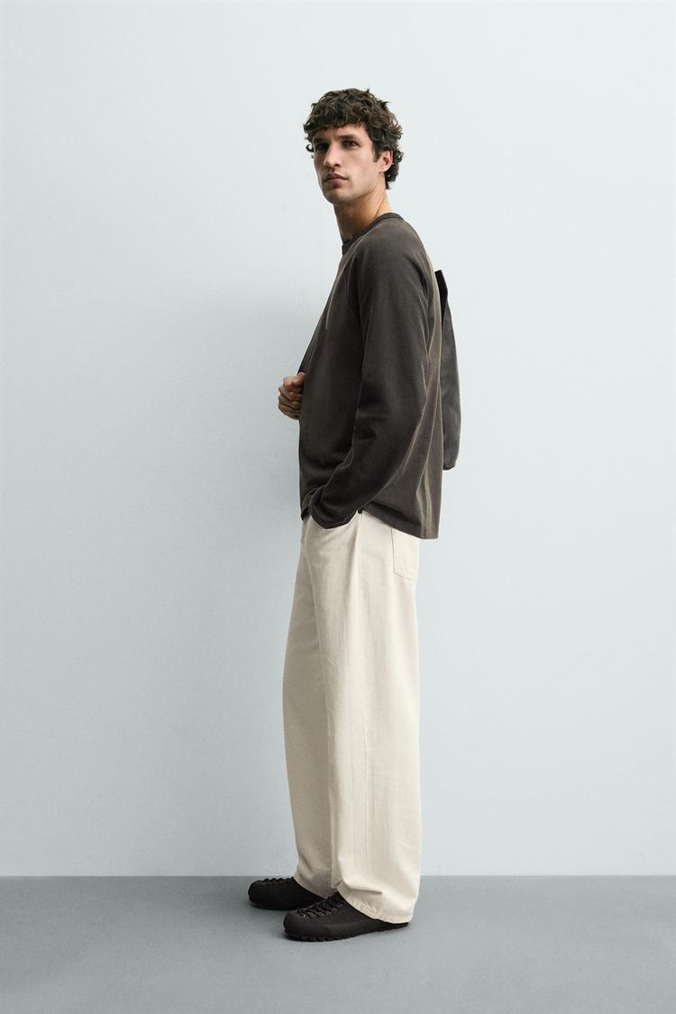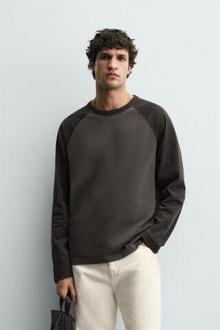 Футболка классического кроя. Круглый вырез и длинные рукава реглан контрастного цвета. Эффект потертости.