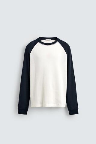 Футболка классического кроя из хлопкового трикотажа вафельного плетения. Контрастный круглый вырез и длинные рукава реглан.