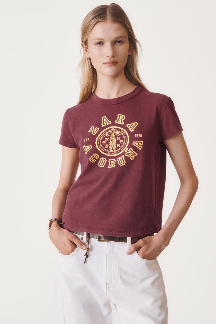 ZARA ФУТБОЛКА В СТИЛЕ ПРЕППИ «50TH ANNIVERSARY», ГРАНАТОВЫЙ