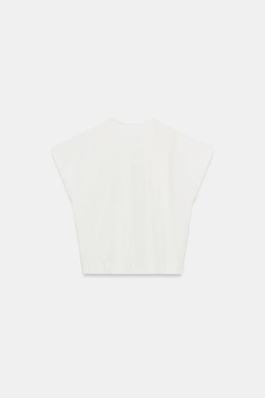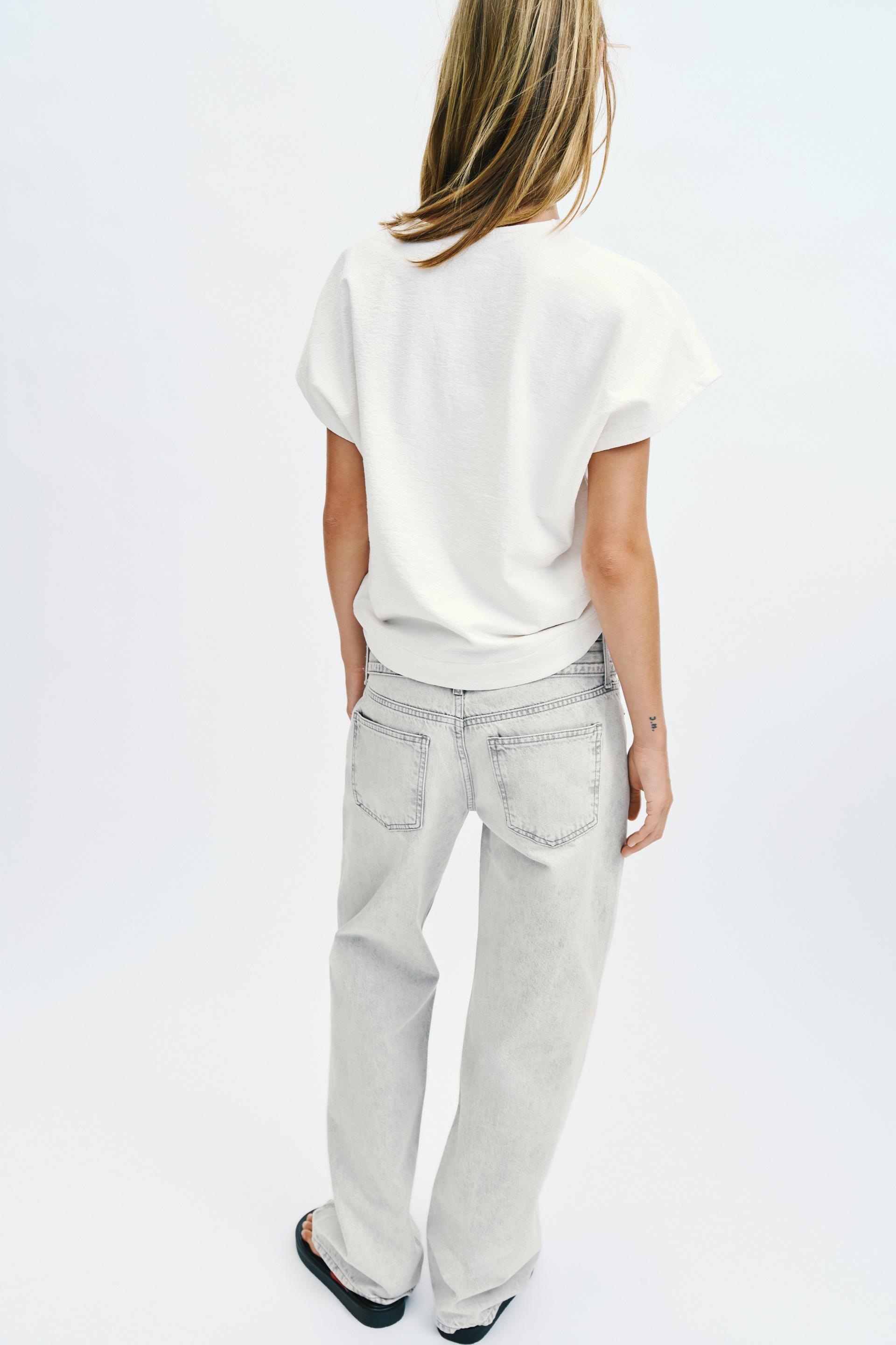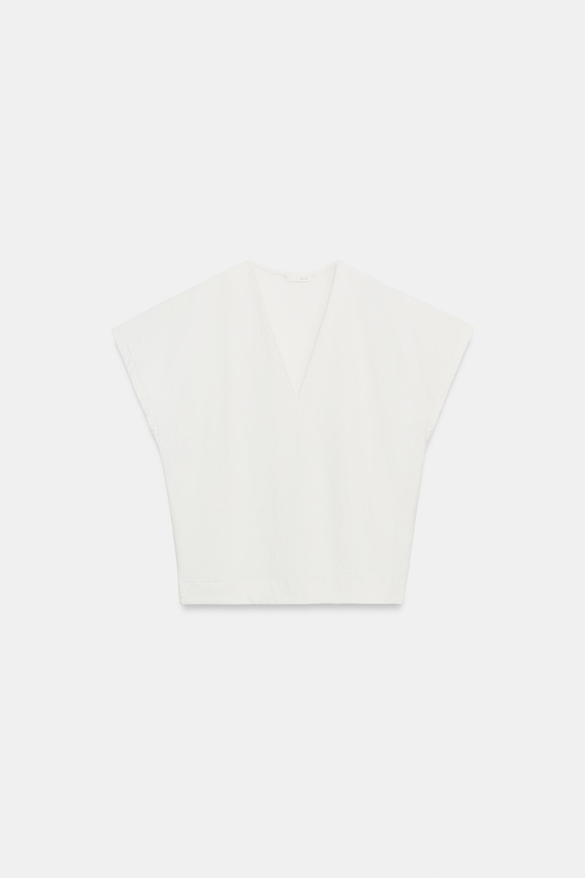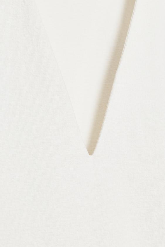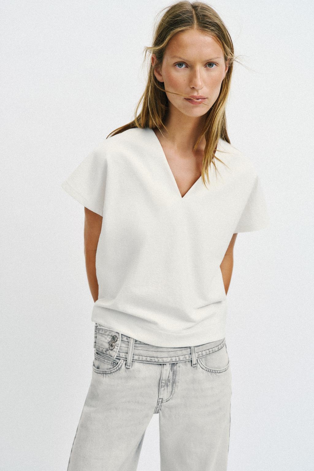 ZARA ФУТБОЛКА В СТИЛЕ РУСТИК С V-ОБРАЗНЫМ ВЫРЕЗОМ, ЖЕЛТОВАТО-БЕЛЫЙ