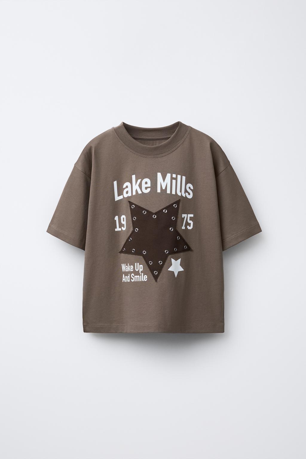 Футболка с круглым вырезом и короткими рукавами. Текстовый принт и нашивка в виде звезды с люверсами. Ткань 100% хлопок.