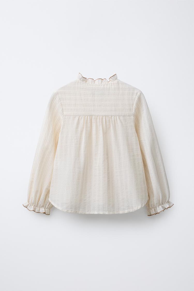 Рубашка с круглым вырезом, длинными рукавами и резиновыми деталями на манжетах. Передняя часть застегивается на пуговицы. На воротнике, груди и рукавах принты из рюш. С контрастной цветистостью и яркими полосами.