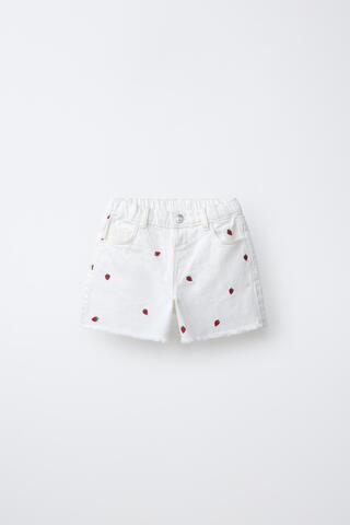 Бермуды с регулируемым изнутри поясом и застежкой на кнопку спереди. Передние карманы и накладные карманы сзади. Вышивка в виде клубники. Casa Lawa x Zara Kids.