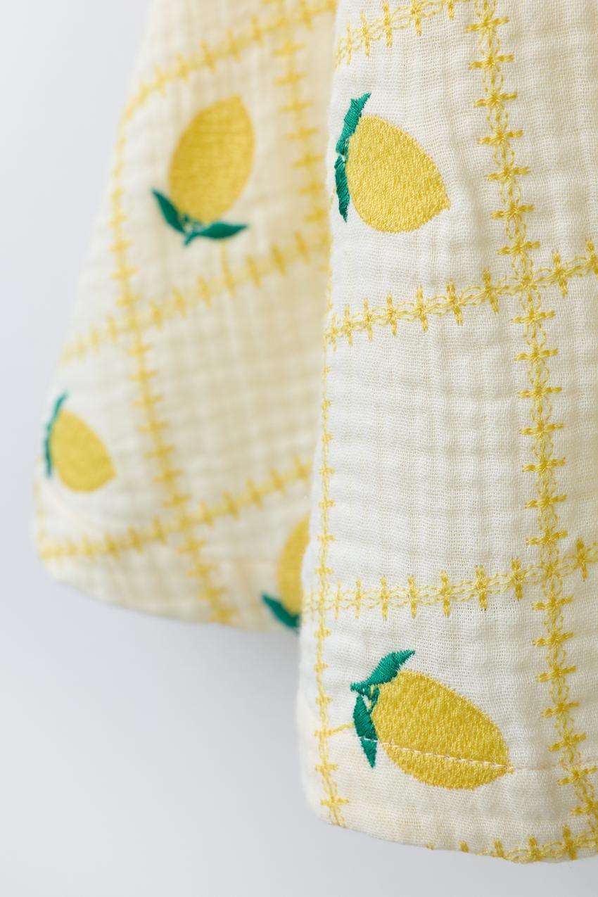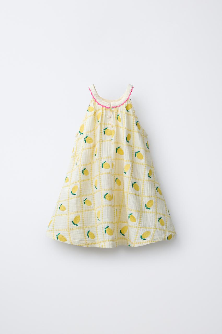Платье с горловиной халтер без рукавов. Принт в клетку и вышивка в виде лимонов. Застежка-капелька с пуговицей сзади. Casa lawa x Zara Kids.
