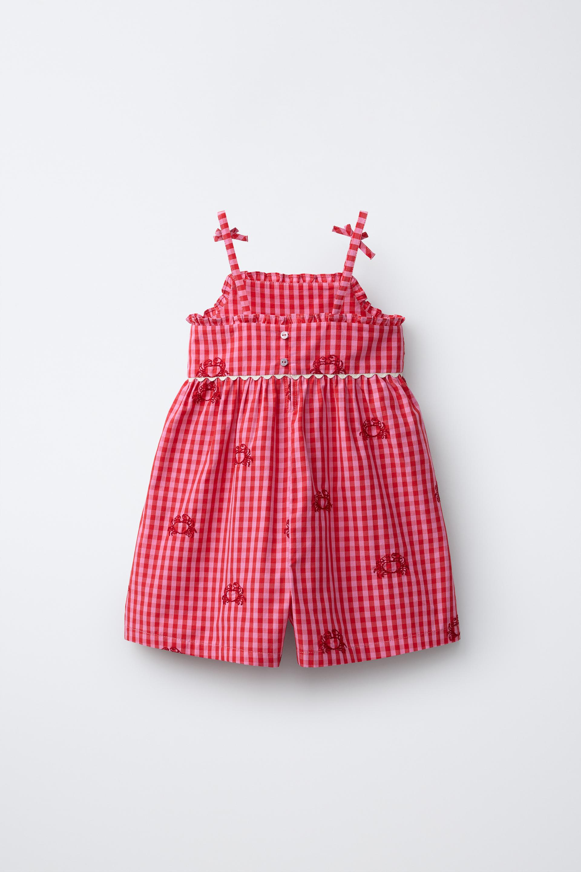 Короткий комбинезон с квадратным вырезом и бретельками с бантами. Застегивается на пуговицы сзади. Принт в клетку виши и вышивка крабов.
