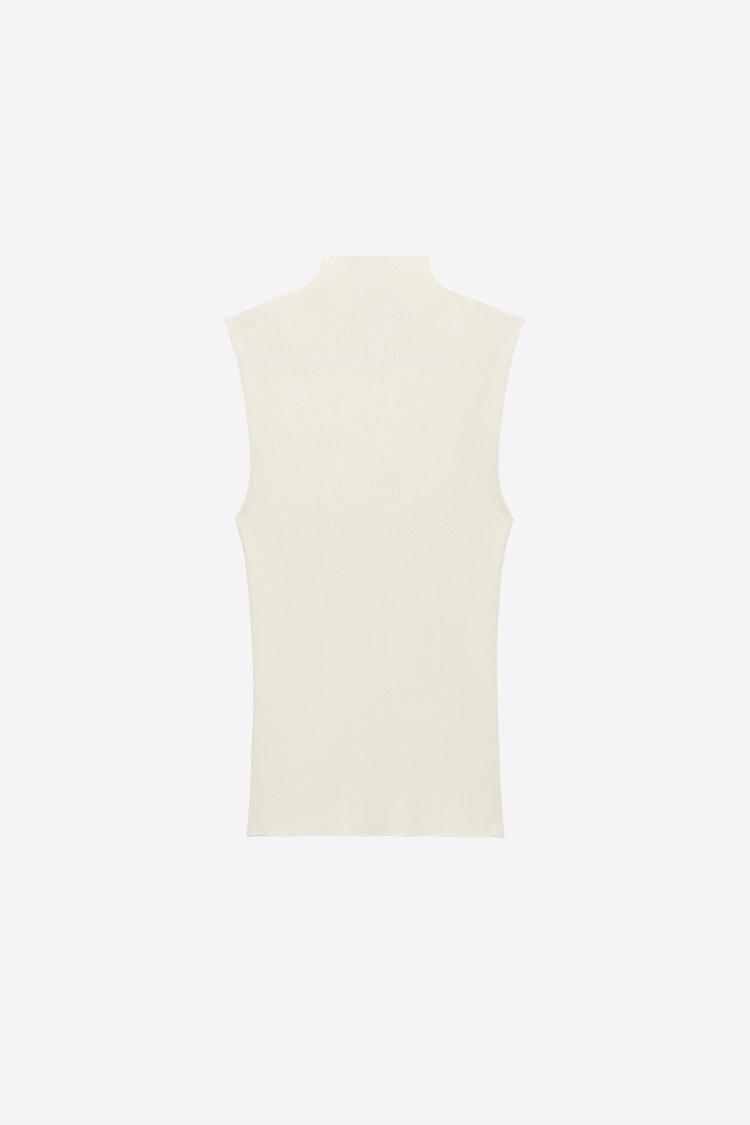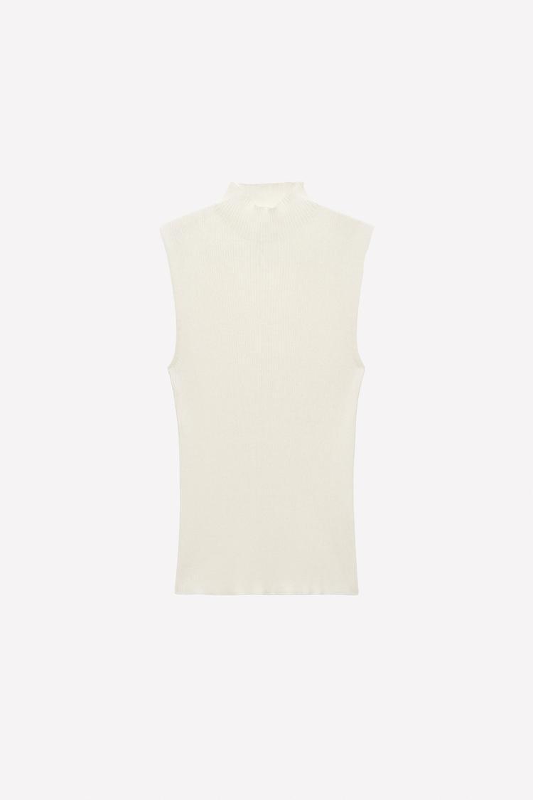 Облегающий лёгкий трикотажный джемпер из смесовой хлопковой пряжи. С воротником-стойкой и без рукавов.