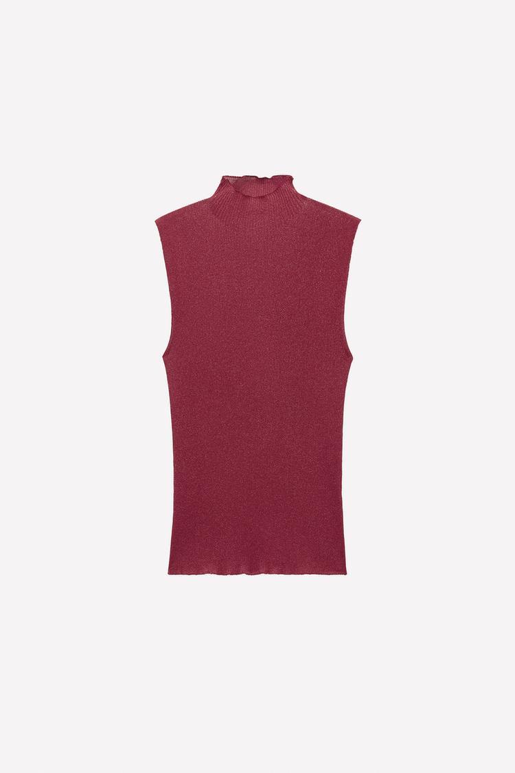 Облегающий лёгкий трикотажный джемпер из смесовой хлопковой пряжи. С воротником-стойкой и без рукавов.