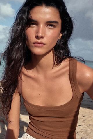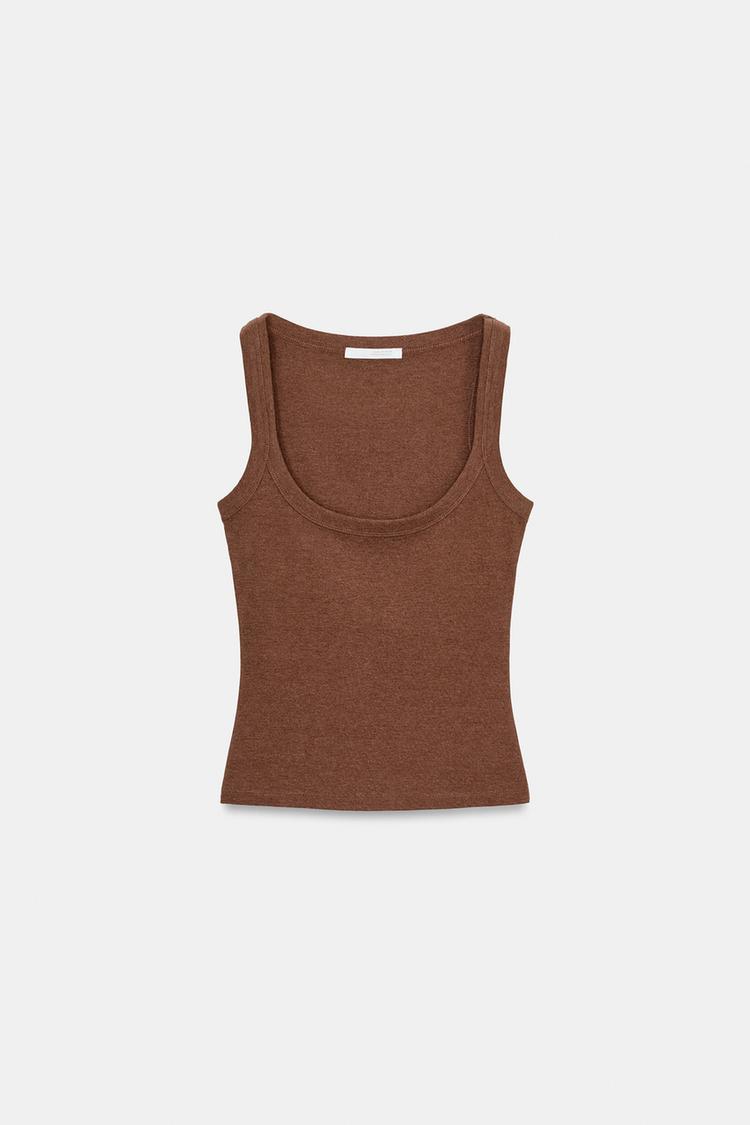 ZARA ХЛОПКОВАЯ ФУТБОЛКА БЕЗ РУКАВОВ, РЫЖЕВАТО-КОРИЧНЕВЫЙ МЕЛАНЖ