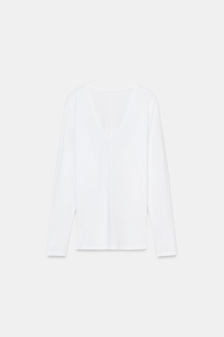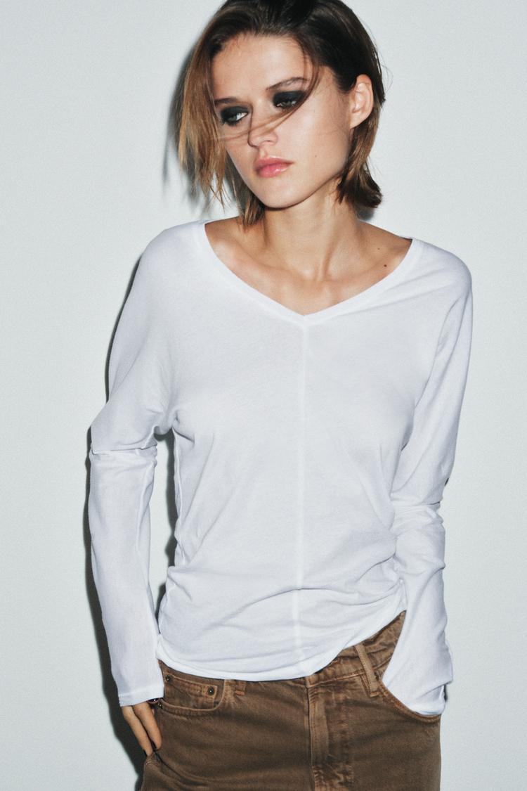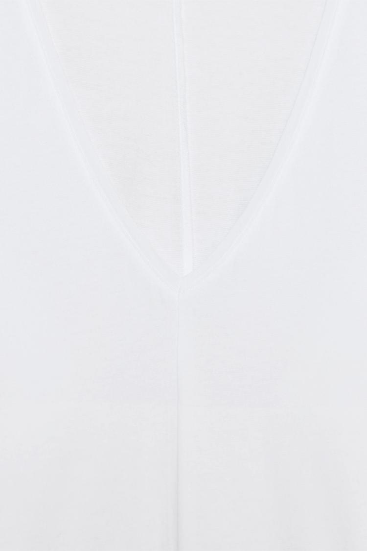 ZARA ХЛОПКОВАЯ ФУТБОЛКА С V-ОБРАЗНЫМ ВЫРЕЗОМ, БЕЛЫЙ