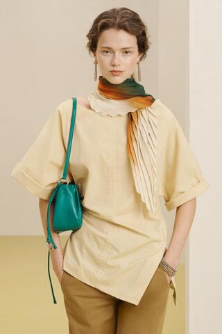 Сбоку плиссированная, с боковыми разрезами и асимметричным подолом с соответствующими пуговицами, широкий воротник и короткие рукава с присборенными краями.