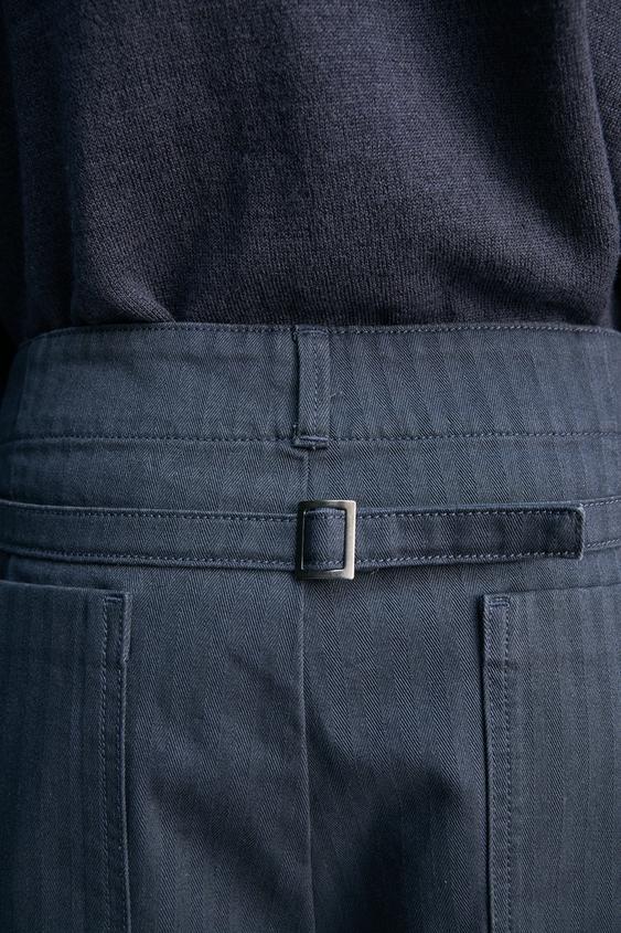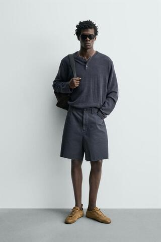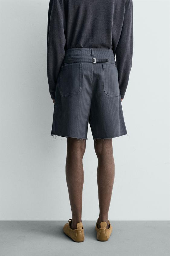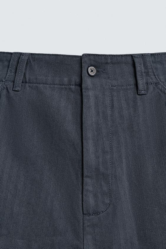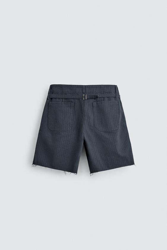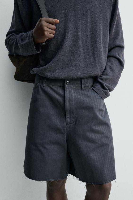 ZARA ХЛОПКОВЫЕ ШОРТЫ ИЗ ТКАНИ В ЁЛОЧКУ С ЭФФЕКТОМ ПОТЕРТОСТИ, ТЕМНЫЙ ИНДИГО