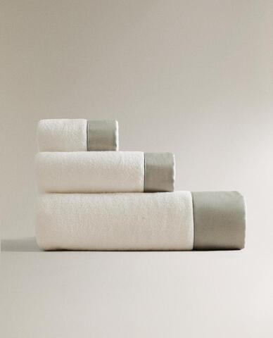Хлопковое банное полотенце с гладкой текстурированной полосой внизу, контрастирующей с основной частью полотенца.