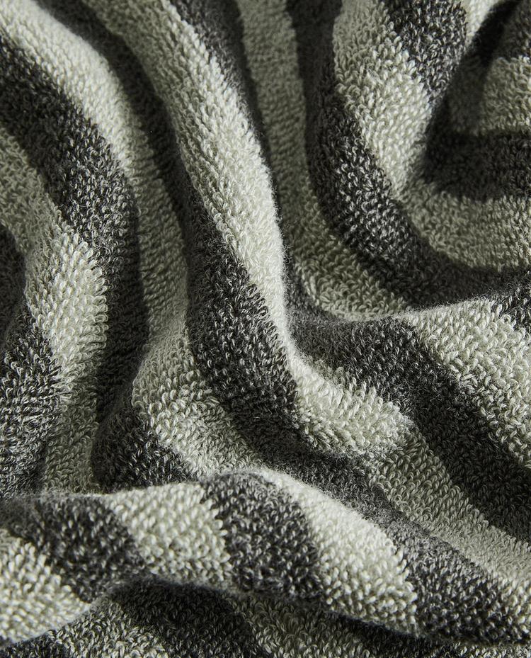 Двустороннее банное полотенце из махровой хлопковой ткани в двухцветную полоску.