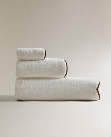 Банное полотенце из хлопковой махровой ткани с фестончатым краем, отделанным контрастной строчкой.