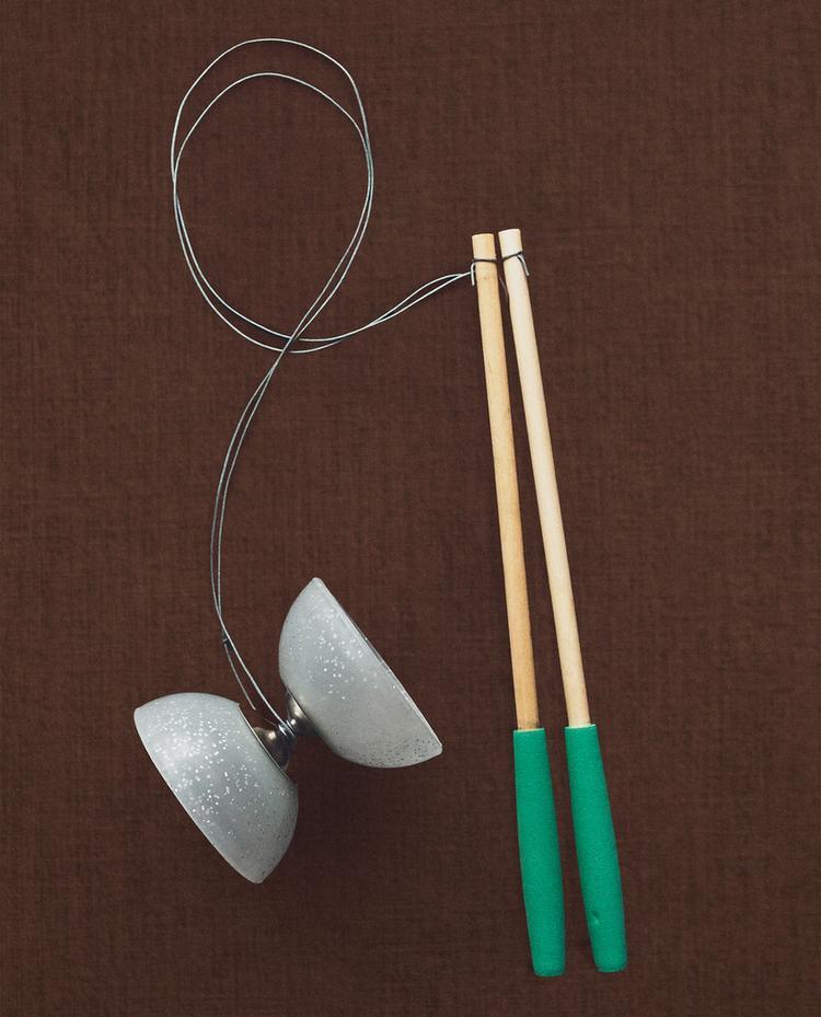 Детская игрушка «Диаболо» с блестящей отделкой. Стержни изготовлены из сосны.