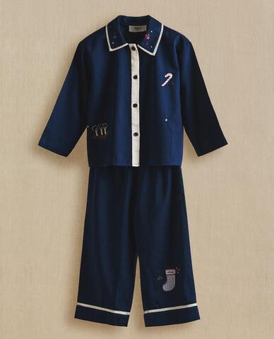 Детский комплект пижамы из хлопка. Комплект включает в себя брюки с регулируемой талией и контрастными отворотами, а также рубашку с длинными рукавами, отложным воротником и застежкой на пуговицы спереди. Украшен рождественской вышивкой и нашивками.