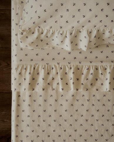 Детская простыня из стираного хлопка плотностью 200 нитей на дюйм с цветочным принтом и оборкой.