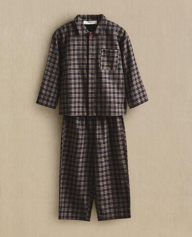 Детский рождественский комплект пижамы из хлопковой фланели в клетку. Штаны с регулируемой талией и рубашка с длинными рукавами, воротником и застежкой на пуговицы спереди.