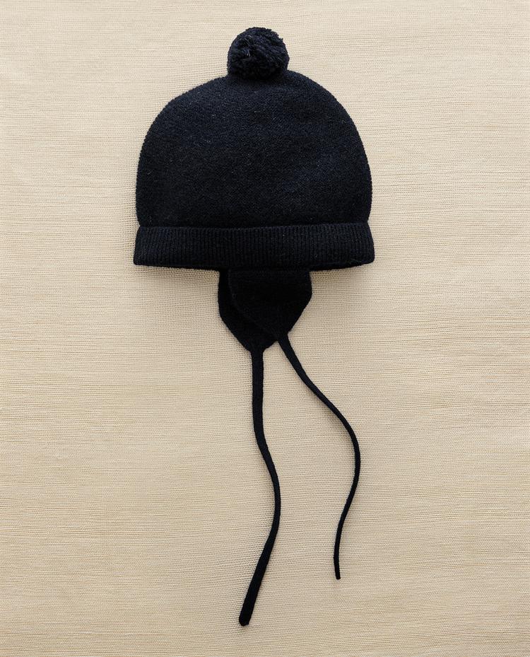 Кашемировая детская шапочка с помпоном и ремешками для завязывания.