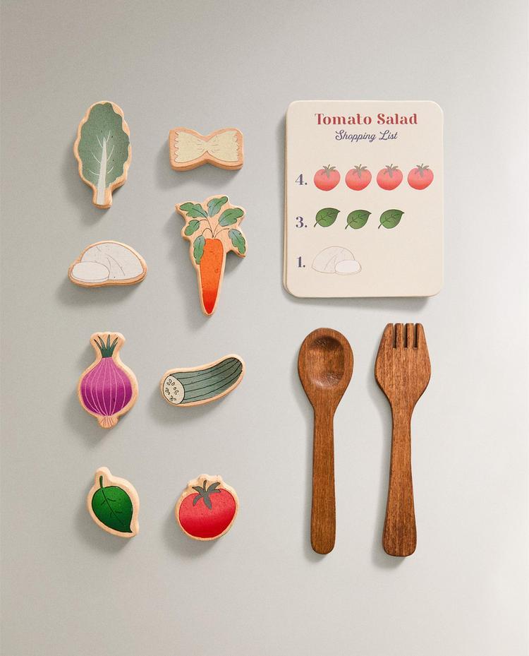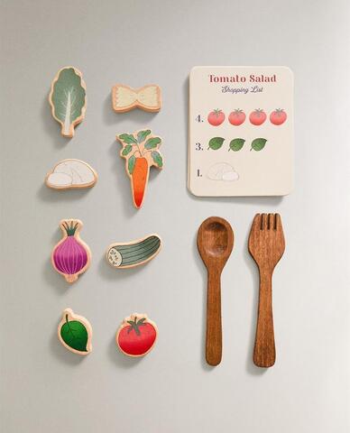 В набор входят 29 предметов: деревянная миска, ложка и вилка, три карточки с рецептами и различные деревянные кусочки продуктов (помидор, лук, морковь, огурец, салат, макароны и сыр).